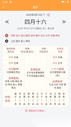 2)进入黄历页面后,默认显示当日黄历信息,包括宜忌事项、吉神凶煞、五行属性等