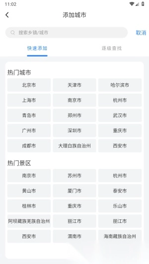 3)在城市管理界面,点击“添加城市”号按钮,输入您想要添加的城市名称,或在推荐列表中选择