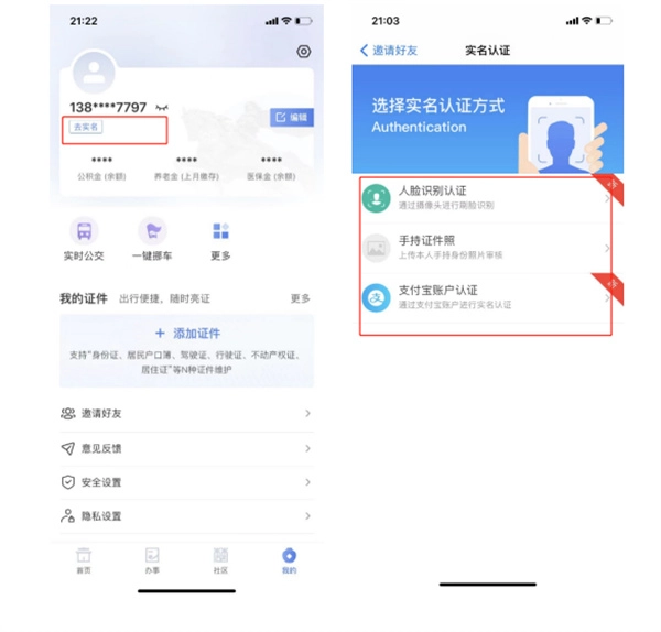 2、登录成功后,点击【我的】点-【去实名】,选择任一方式进行实名认证。