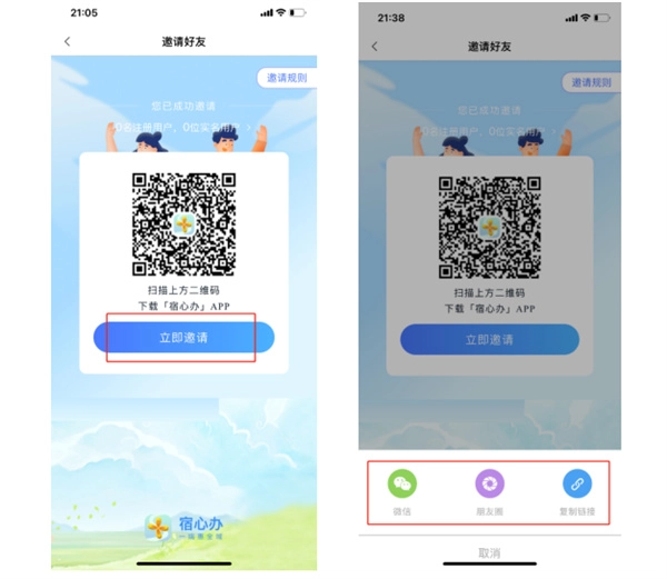 3、用户实名认证后,即可通过【我的】-【邀请好友】出示个人二维码或通过【立即邀请】进行 分享,扫描该用户二维码或通过该用户分享链接注册成功的用户也将计入该单位注册用户数。
