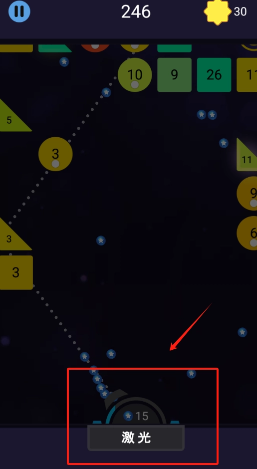 3、用手指滑动屏幕控制弹球方向,多撞带数字的球体,攒够30颗星星。