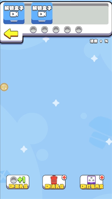 3、在玩法页,可通过【加孔位】【清孔位】【打包两会】这些操作,观看广告来解锁【盒子】,并将进度推进至100% 。