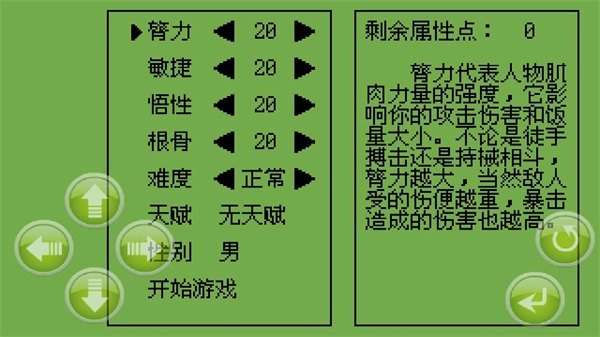3、这里玩家可以对人物的臂力、敏捷、悟性、根骨等进行分配属性点,然后点击开始游戏;