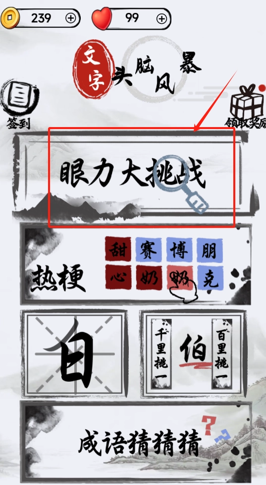 1. 点击签到领取奖励,从眼力大挑战或成语猜猜猜中选择一项开启游戏,在页面右上角能够查看金币和爱心数量。