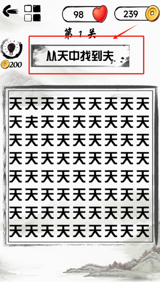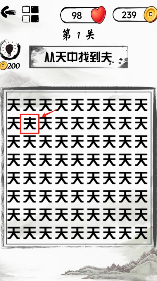 3、在满屏天字中找出唯一夫字,可消耗提示道具,左上角显示关卡进度和剩余爱心。