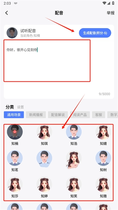 4、点击AI配音,输入配音内容,选择喜欢的配音角色,点击生成配音即可