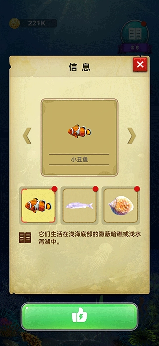 4、玩家还可以点击游戏界面上方的水族馆查看解锁鱼的信息