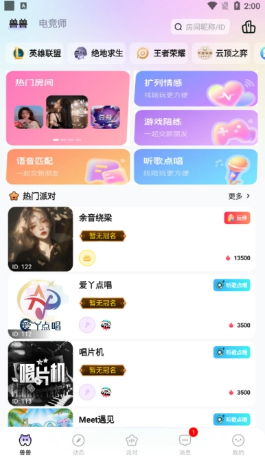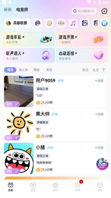 兽兽开黑安卓版,专为游戏爱好者打造的语音开黑神器。这款软件不仅具备多种多样的开黑功能,还提供专业陪玩服务。各类最新热门游戏任你挑选,能在线创建语音房间,邀请好友一同开黑互动。同时,它还能对用户语音进行优化,并有海量丰富的语音包内容。热爱开黑的小伙伴们,千万别错过!