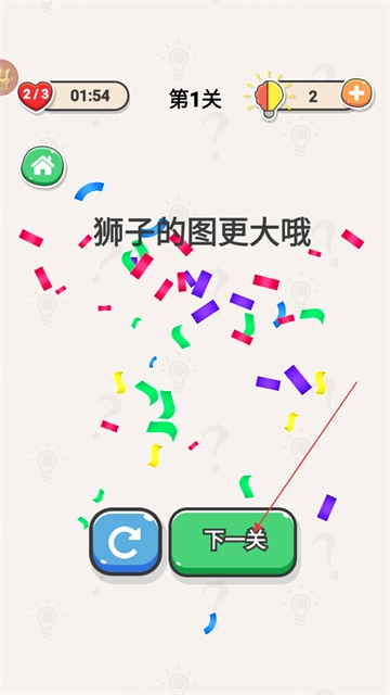 5、无限制尝试:答错不扣分且可无限重试,每失败一次就离奇葩解法更近一步,轻松氛围中享受试错带来的灵感迸发。