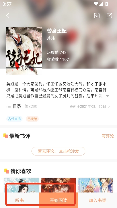 可直接进入心仪的小说界面,在此界面能够选择听书、阅读等操作。