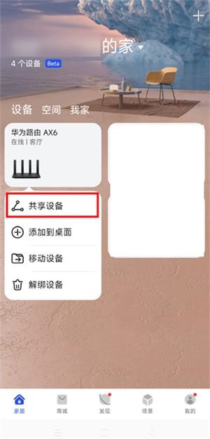 2、在首页长按您需要共享的路由器卡片,选择共享设备,您可以通过扫码共享和通过华为帐号共享两种方式进行操作。