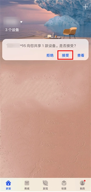 2、在首页有弹窗,咨询您是否接受共享设备,点击接受后,共享的路由器将以卡片的方式显示在首页中,卡片左下角有共享字样。