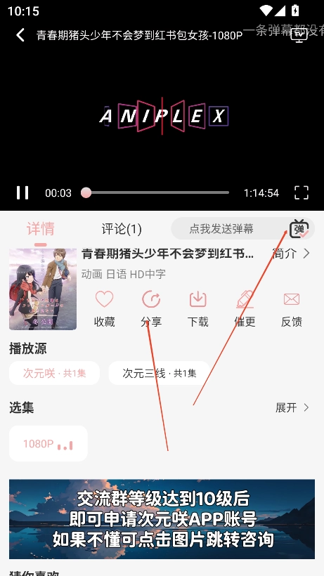 进入番剧界面,可以分享给好友,也可以参与弹幕互动,与其他好友一起看剧互动
