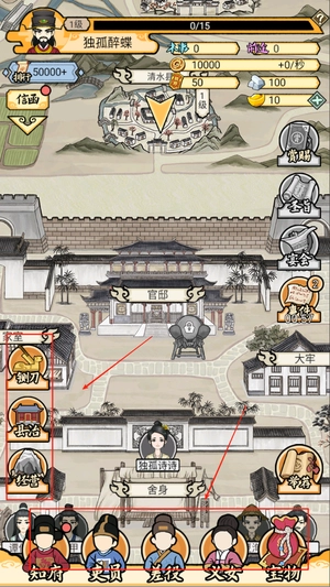 2、左侧滑动查看地图区域,右侧点击执行具体操作,如派遣官员或升级建筑。