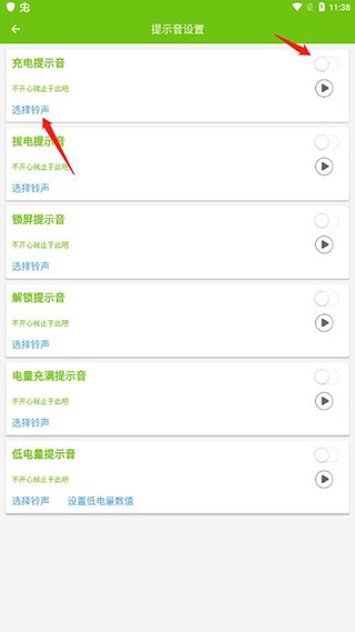 6、充电提示音:用户可以自定义充电时和拔掉充电器时的提示音。