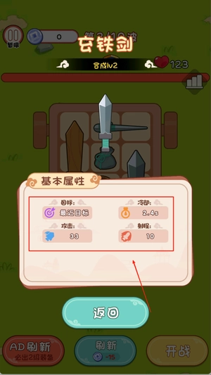 3、战斗采用自动进行模式,背包中的武器会在回合开始自动攻击,击杀敌人后获得经验奖励。