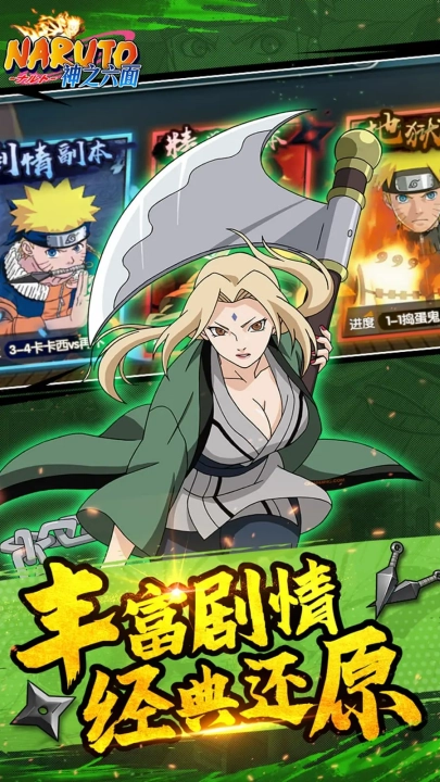 1、游戏以火影忍者为背景,玩家可以收集各种忍者卡牌,组建自己的战队,并挑战各种强敌。