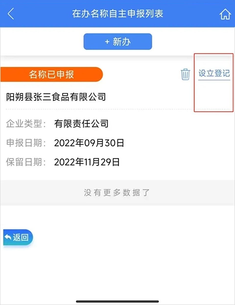 4、完成名称自主申报后,点击右上角“设立登记”进入设立流程。