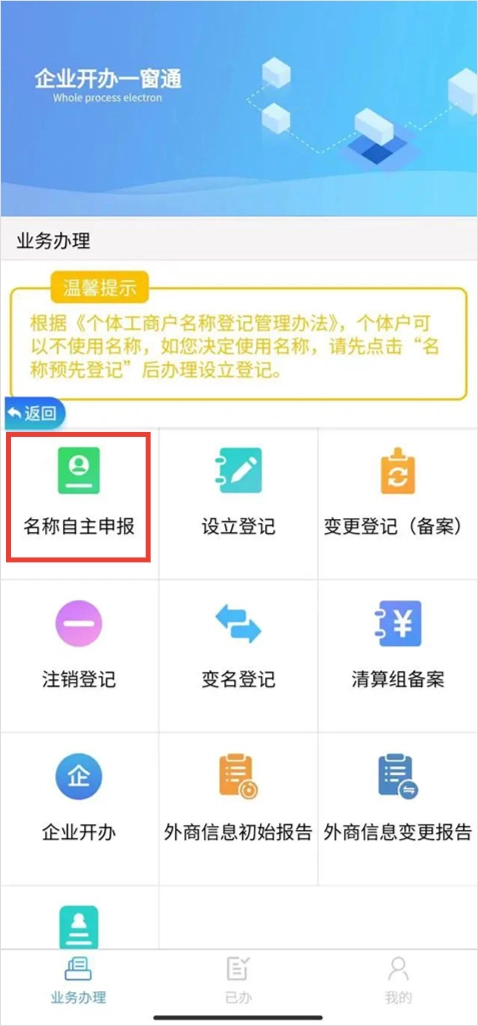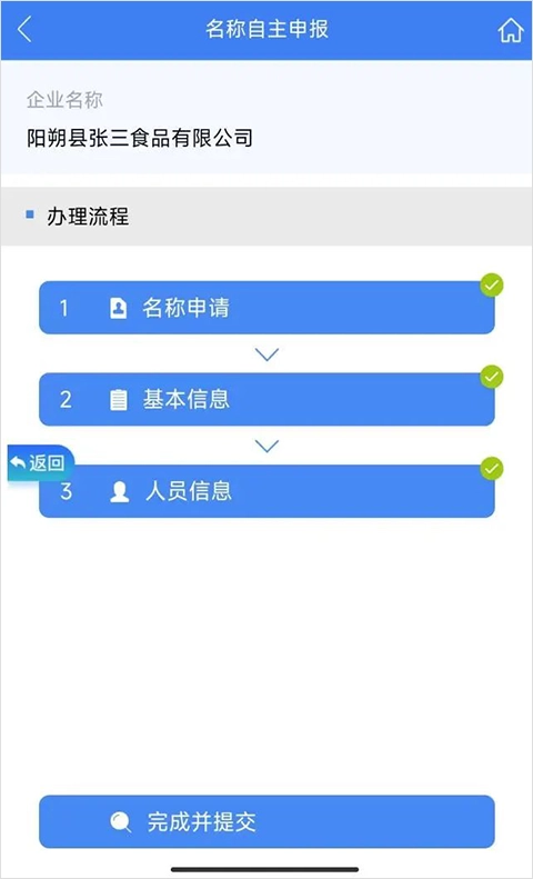 3、点击“名称自主申报”按要求填写信息完毕后,点击“完成并提交”。