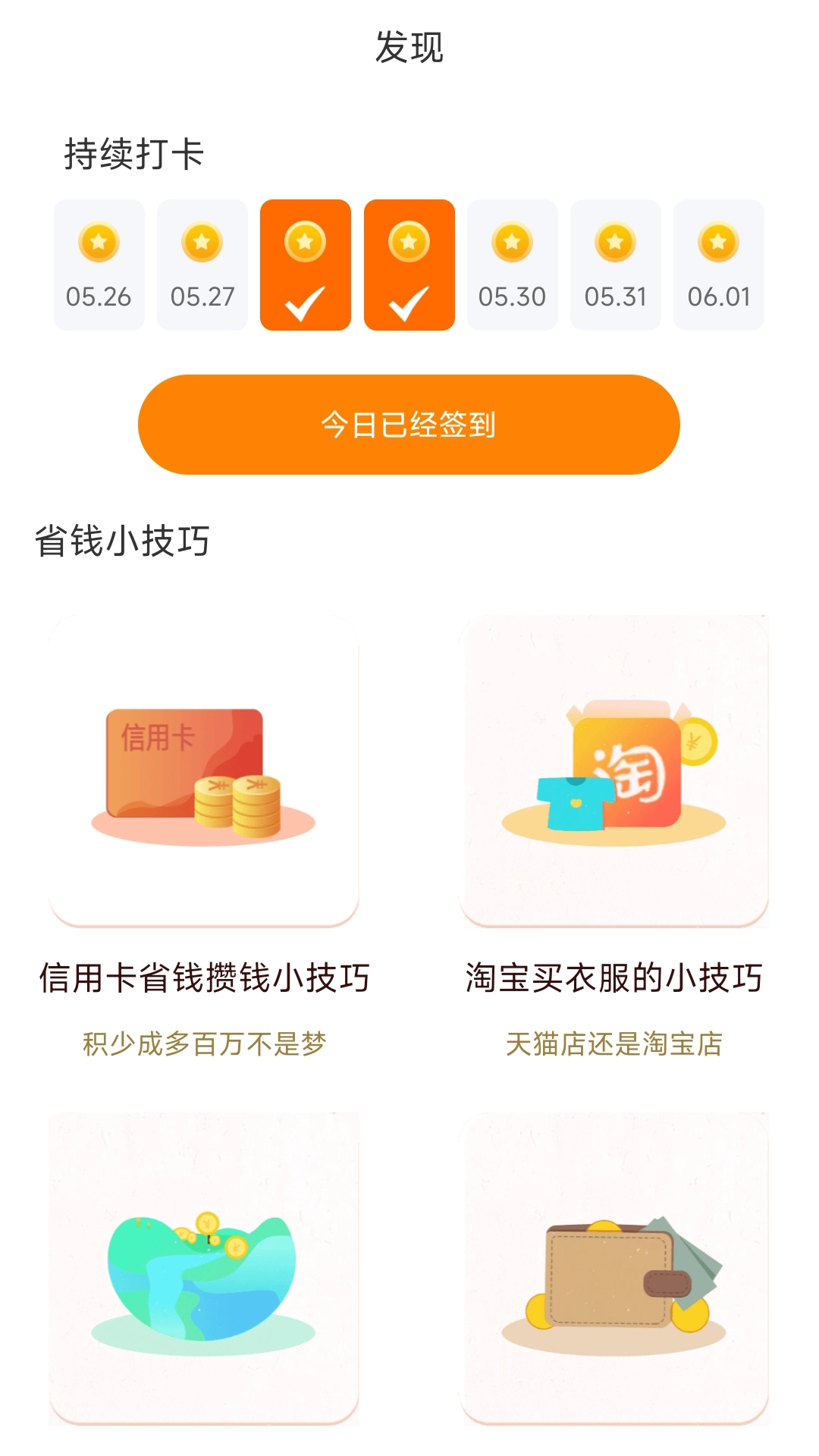 2、发现页面中可以进行签到就可以领取金币,同时可以进行了解省钱小技巧。
