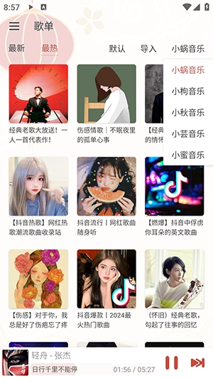 1、点击歌单板块,在导入旁边,点击默认的小蜗音乐,可以切换音源。