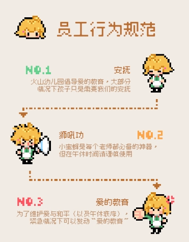 午休时间一到,玩家就会化身幼儿园老师,挑起哄孩子们午睡的大梁。一位老师得同时安抚好几个调皮又可爱的萌娃,这可绝非易事。关卡的难度还会循序渐进地增加,玩家既能借助各类道具来助力,也能够亲自出马去安抚孩子们。