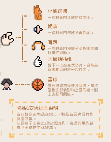 一个老师安抚多个孩子,玩家可以利用道具,也可以自己亲自安抚