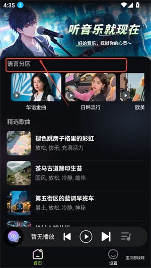 3、往下浏览,还有语言分区,以及精选歌曲等