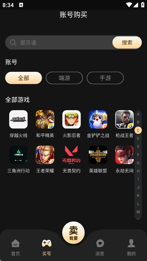 2、在买号的页面中可以针对不同的账号进行交易,还可以了解端游以及的分类账号。