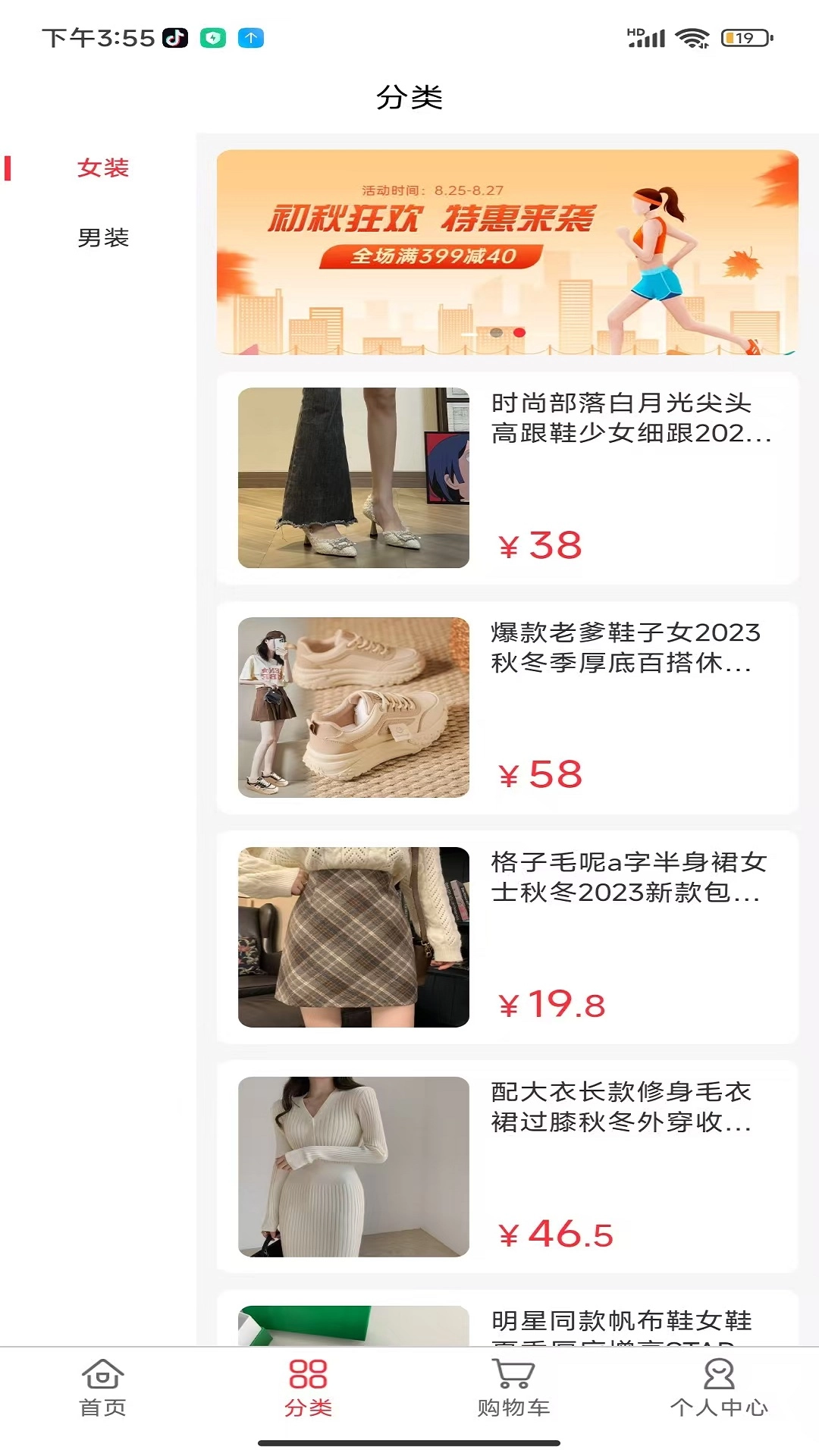 1、分类包含女装和男装这两大类别,你能够依据分类来做出选择。