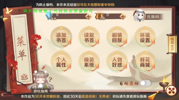 3、用【添加书签】【读取书签】管理进度,【剧情回放】重温情节,【环境设置】调参数;借【个人属性】【人物好感】了解状态,【换装系统】【鲜花商城】丰富体验。