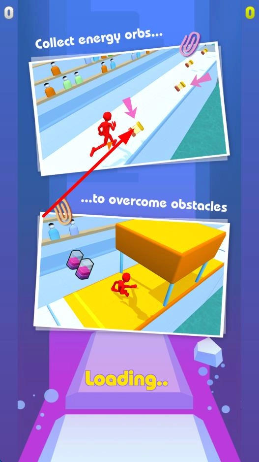 2、途中收集金币和能量道具,金币可解锁炫酷角色皮肤,能量道具能短暂免疫障碍或加速冲刺。