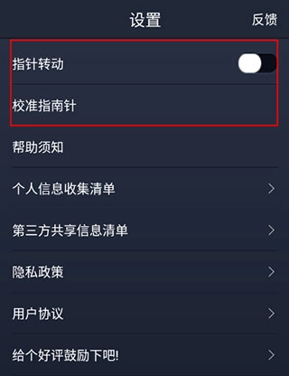 4、在设置界面可以打开指南针转动功能和校准指南针。