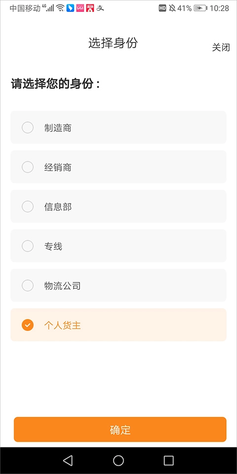 1. 打开应用并完成登录后,第一步请选择您的货主身份,例如制造商、经销商或者个人货主等。