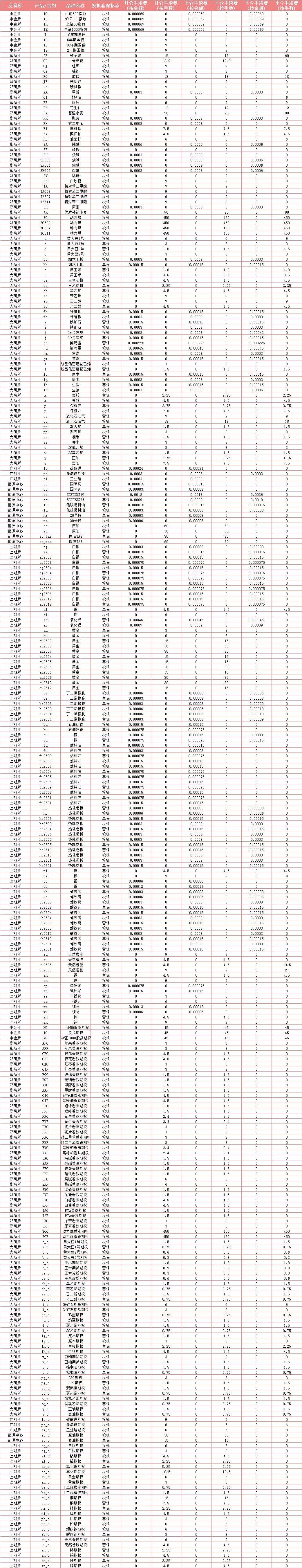1、公司上述手续费标准已包含交易所收取的手续费,交易所收费标准以交易所通告为准,如交易所收费标准发生调整,中信期货期货品种手续费收取标准将等比例调整;