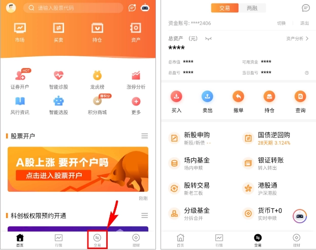 在天风高财生App首页中,点击“交易”按钮,进入交易板块。