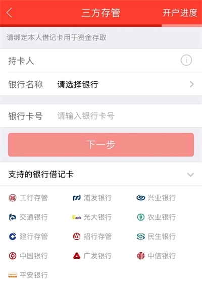 请使用本人名下的银行借记卡绑定三方存管。