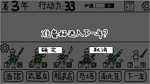 2、在酒馆中玩家可以招募将领,武器店购买武器,服装店购买护甲,马场购买坐骑,南北货则可以购买补给;