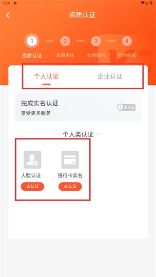 4进入资质认证界面后,找到并点击【个人认证】选项,接着完成人脸核验与银行卡实名验证流程,待审核通过后,就能拥有参与出价的资格了。
