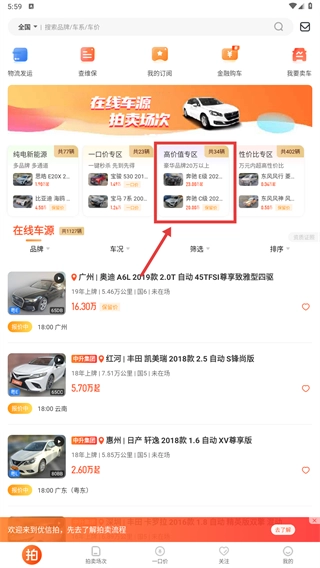 1、在首页点击【高价值专区】,筛选20万以上豪华品牌车型,查看对应车源列表。