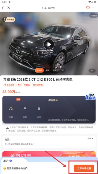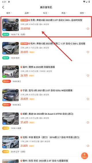 2、在高价值专区列表,选择目标车辆(如奔驰E级2023款),进入车辆详情页。