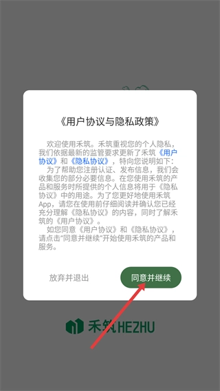 1在弹出的《用户协议与隐私政策》确认窗口中,点击【同意并继续】按钮以确认相关条款,随后即可进入禾筑App的后续功能界面。
