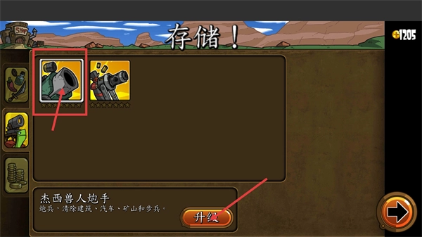 1、在存储界面中选中【杰西兽人炮手】,它是炮兵单位,能够对【建筑、汽车、矿山、步兵】进行清除,点击【升级】按钮可以增强其作战能力,提升关卡中的输出表现。