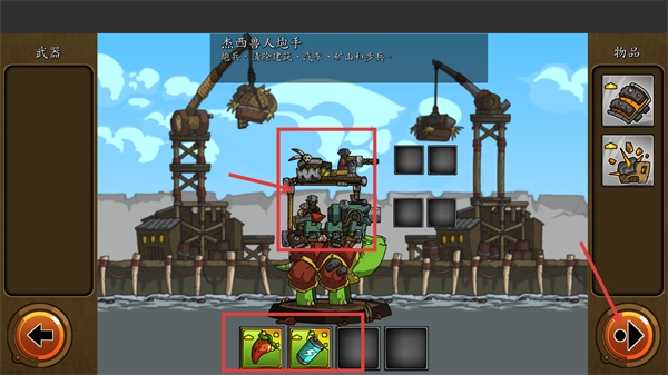 2对局前需完成战备调整:将名为“杰西兽人炮手”的装置装配到角色身上,同时确保携带“辣椒-能量罐”这类物品,最后通过箭头按钮确认装备状态即可。