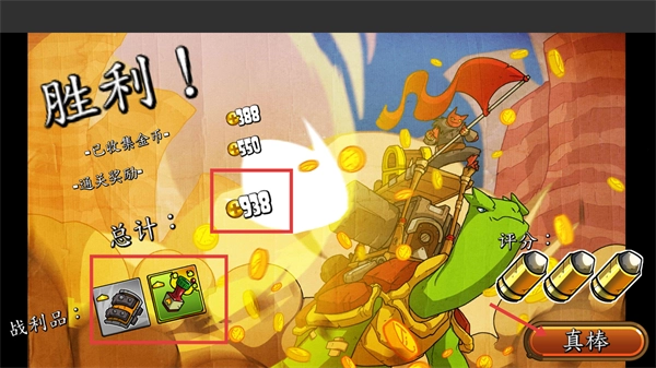 4、通关后可获取【已收集金币-388】和【通关奖励-550】,资源与战利品总计为【938】,点击【真棒】按钮即可完成结算。