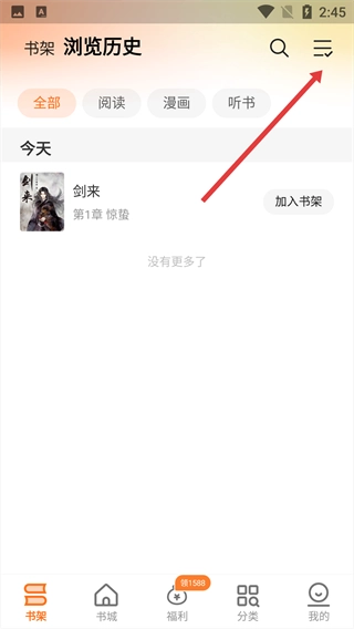 1、进入书架页面,点击顶部的“浏览历史”选项,切换至浏览历史记录界面。