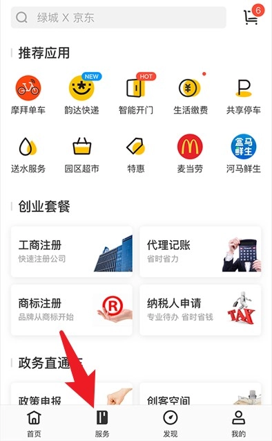 3、点击底部的服务按钮,进入综合服务页面后,就能查看推荐应用、创业套餐等各类便捷功能模块了。