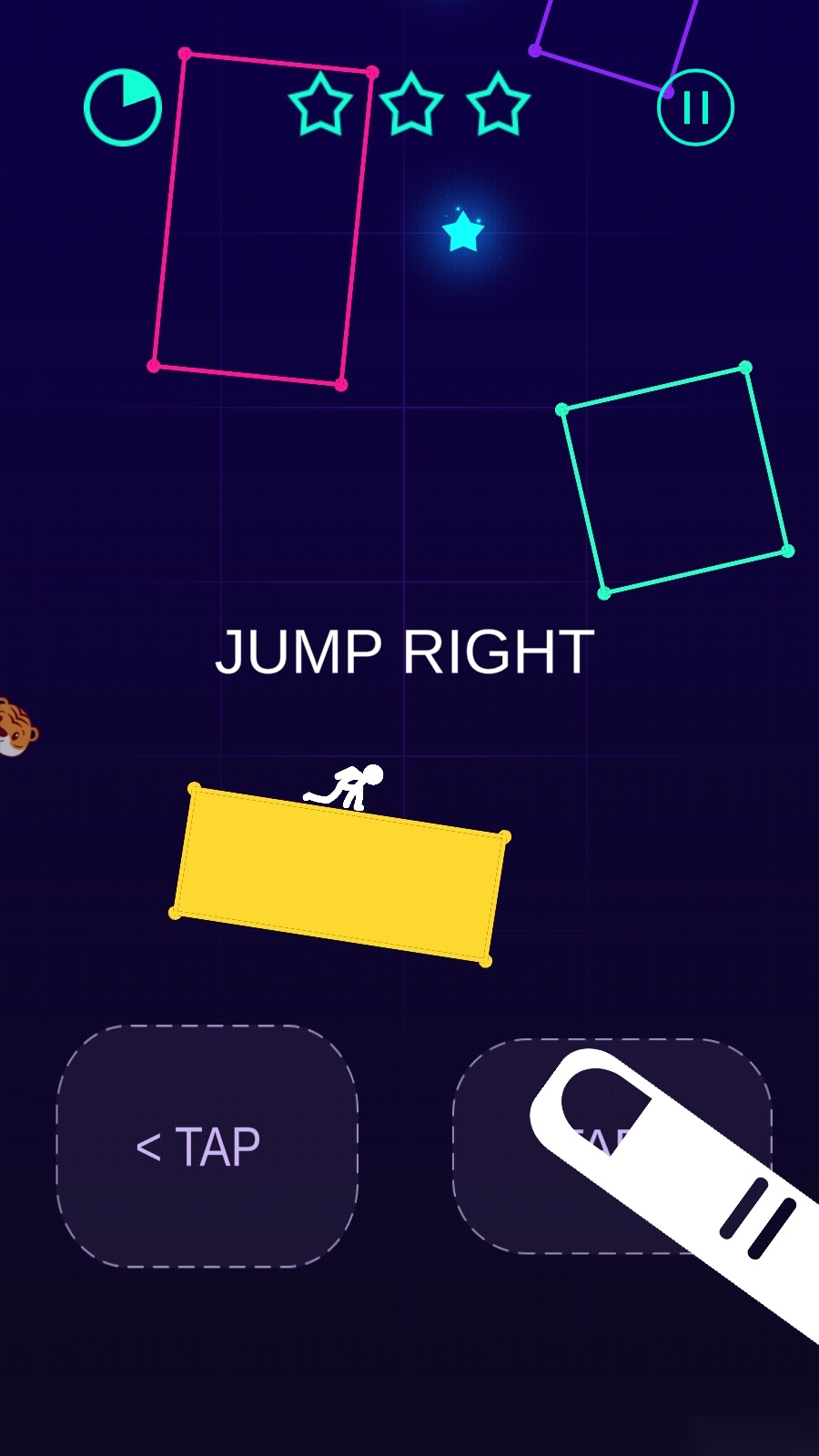 3游戏中会有简洁的操作指引,当你看到提示后,只需点击屏幕上的TAP按钮,角色就能向上跃起,轻松落在各种不同样式的方块上继续前进。
