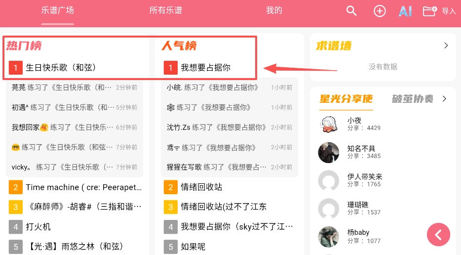 3、在热门榜和人气势区域,你能看到其他玩家最近在练习的曲目,例如我想要占据你,这可以帮你了解流行趋势。