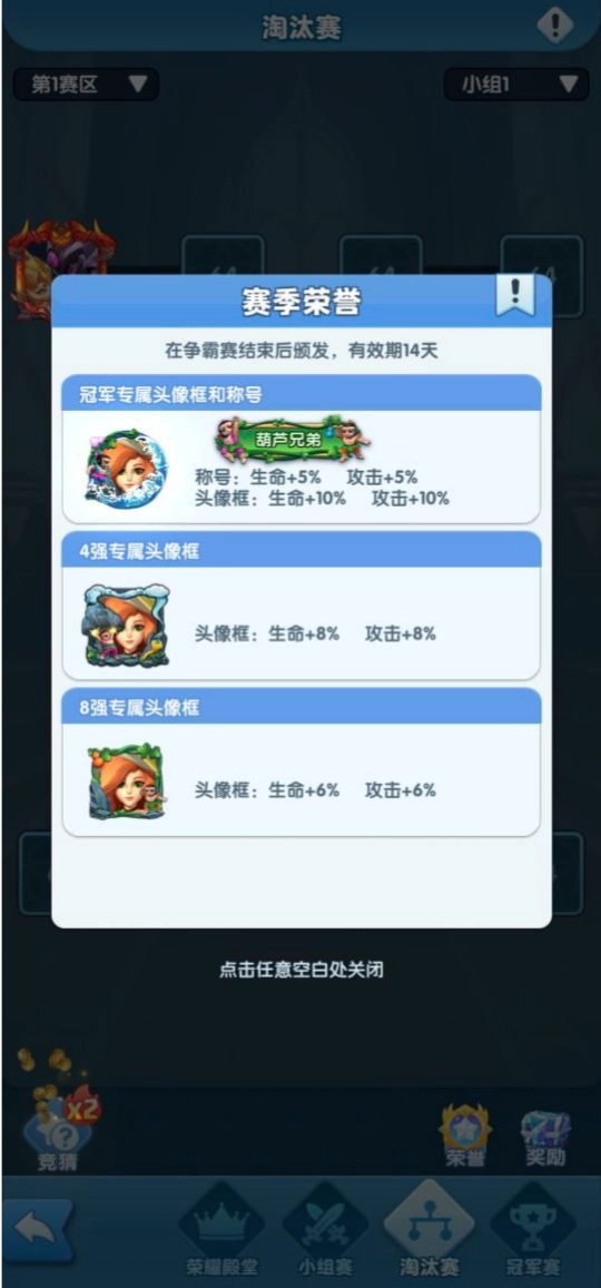 这次赛事因联动合作的助力,奖励与荣誉体系都得到了升级:各赛区的冠军能获得葫芦兄弟系列的动态头像框及专属荣誉称号,而跻身4强和8强的队伍也可领取对应的静态头像框作为参赛纪念。